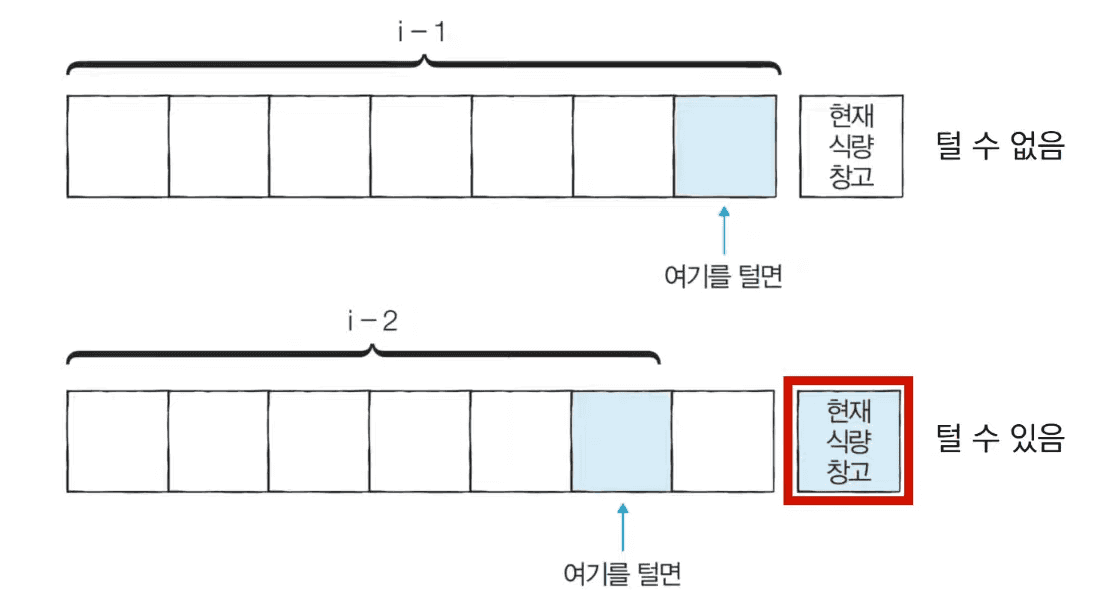 - 한 칸 이상 떨어진 식량창고는 항상 털 수 있으므로 $(i-3)$번째 이하는 고려할 필요가 없다