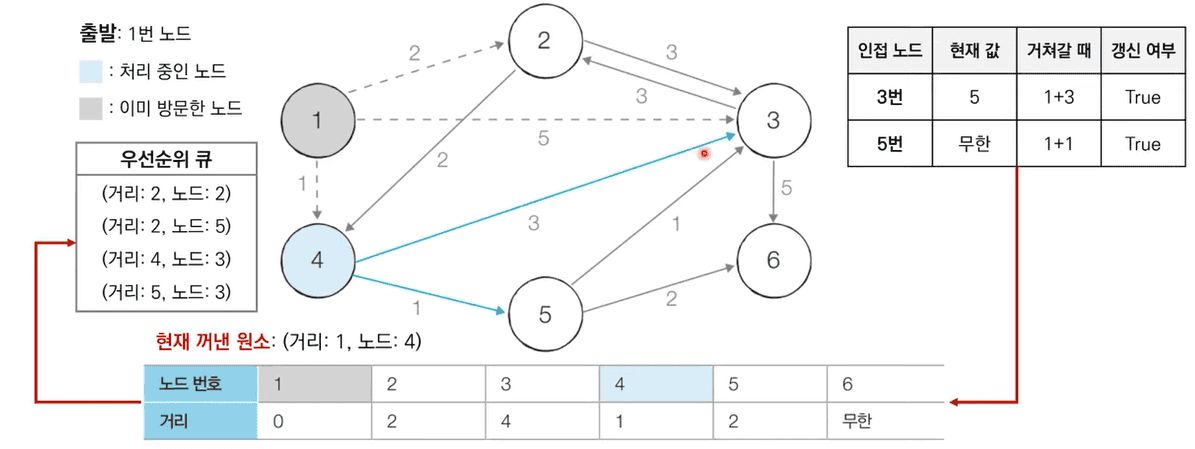우선순위 큐에서 원소를 꺼내 방문 처리를 해준다. 꺼낸 원소는 (0, 1)이며, 노드 1과 이웃인 노드는 4, 2, 3이 존재한다. 각 노드들의 거리와 노드 번호를 우선순위 큐에 넣어주며 각 노드 까지의 거리를 갱신해 준다.